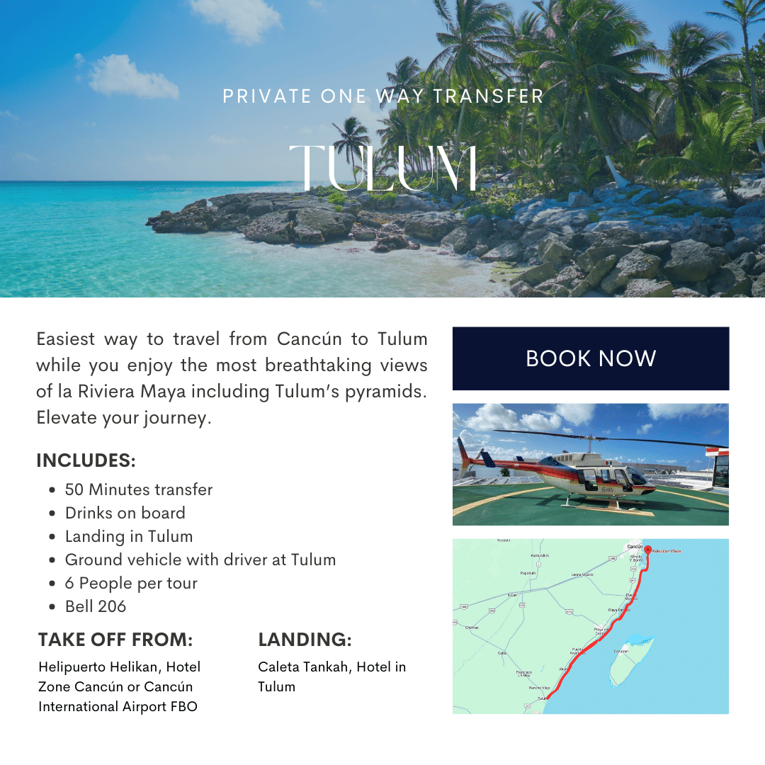 Embark on an extraordinary journey from Cancún to Tulum in just 50 minutes with our exclusive private helicopter transfer with capacity for up o 6 people per transfer.